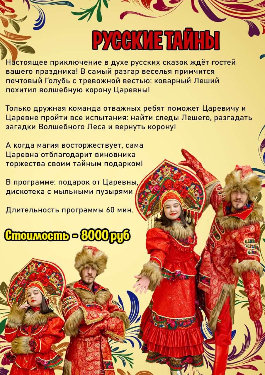 Настоящее приключение в духе русских сказок ждёт гостей вашего праздника! В самый разгар веселья примчится почтовый Голубь с тревожной вестью: коварный Леший похитил волшебную корону Царевны!