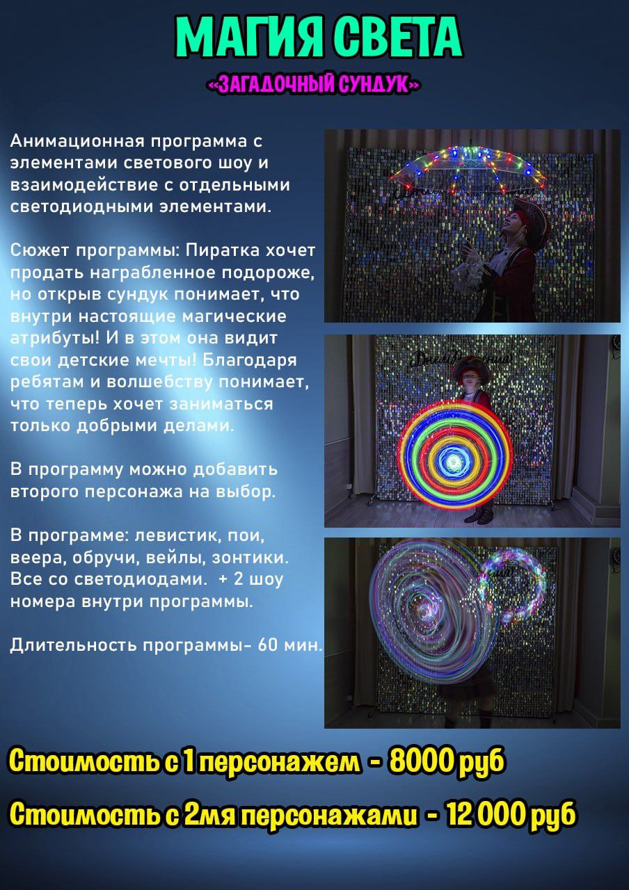 В программе: левистик, пои, веера, обручи, вейлы, зонтики. Всё со светодиодами + 2 шоу номера внутри программы.